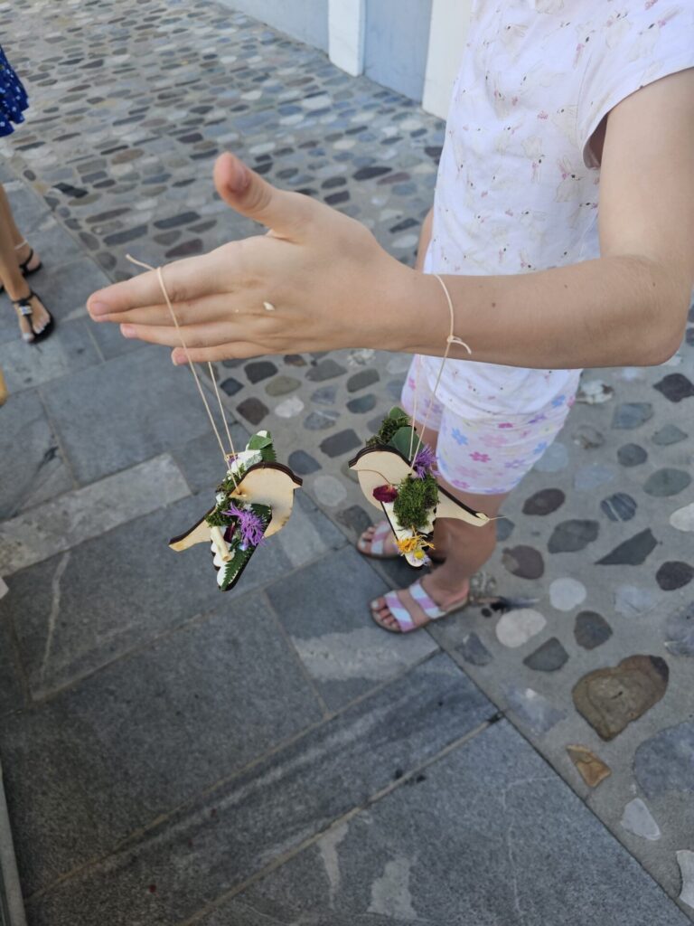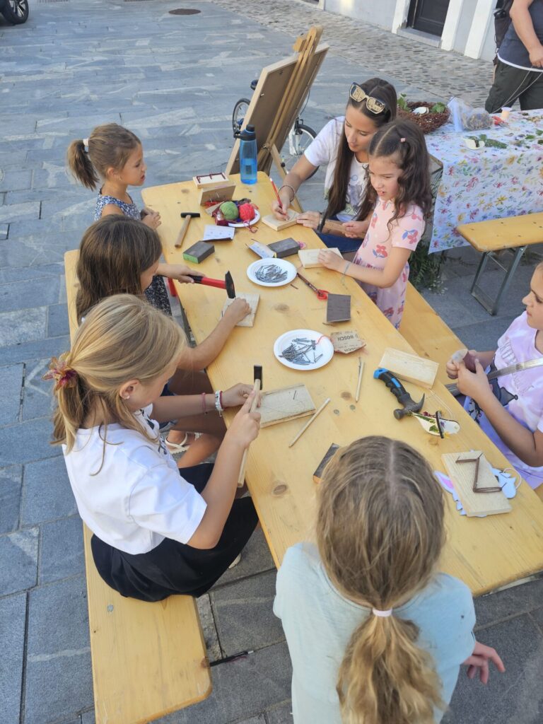 Na tej delavnici so mali mojstri pogumno prijeli kladiva, zabili prve žeblje in izdelali lesene ploščice z začetnico svojega imena. Nato so lesenega ptička okrasili z naravnimi materiali – mahom, travo, listi in cvetlicami. Aktivnost je združila ročne spretnosti, občutek za naravo in sodelovanje, saj so si otroci med seboj pomagali in si izmenjevali ideje.