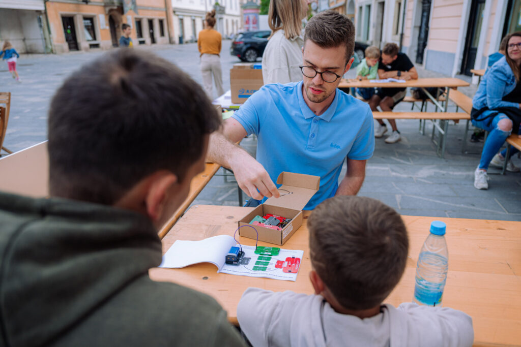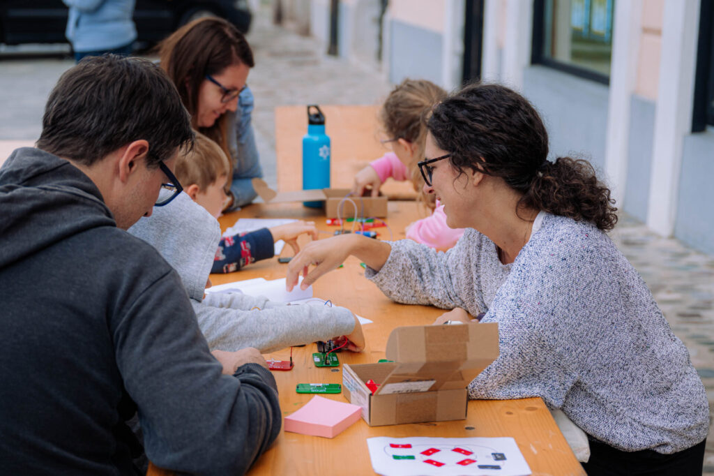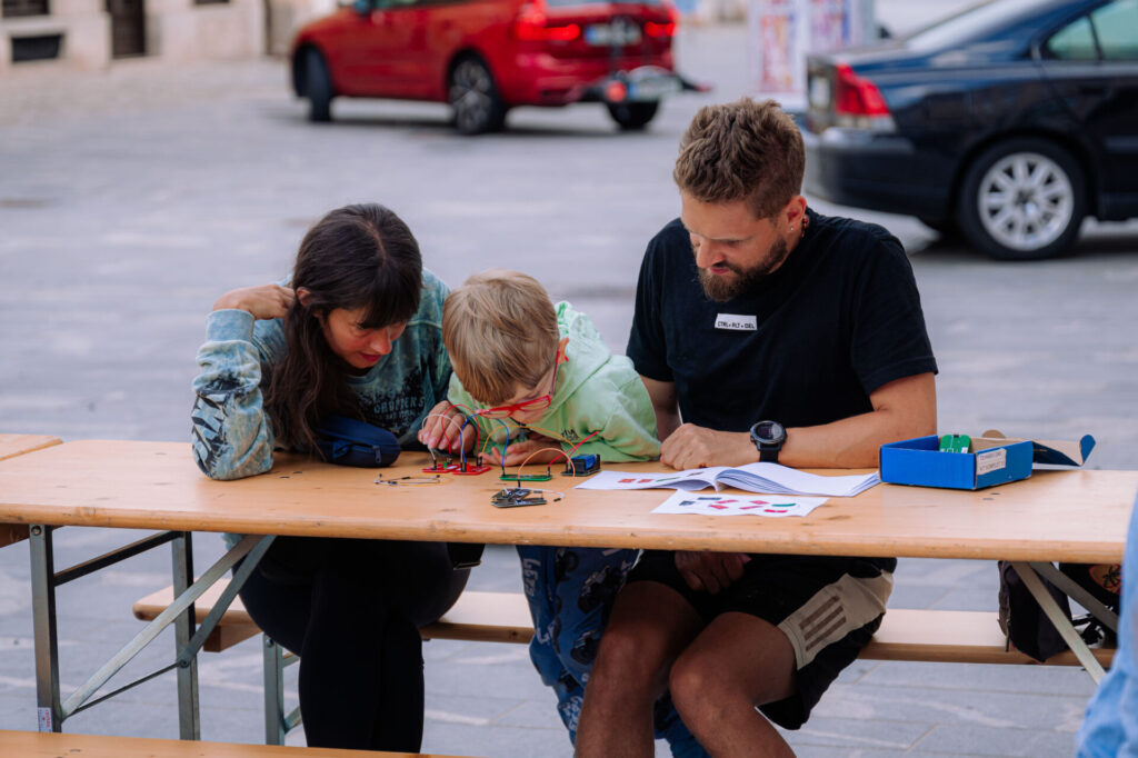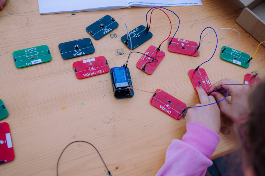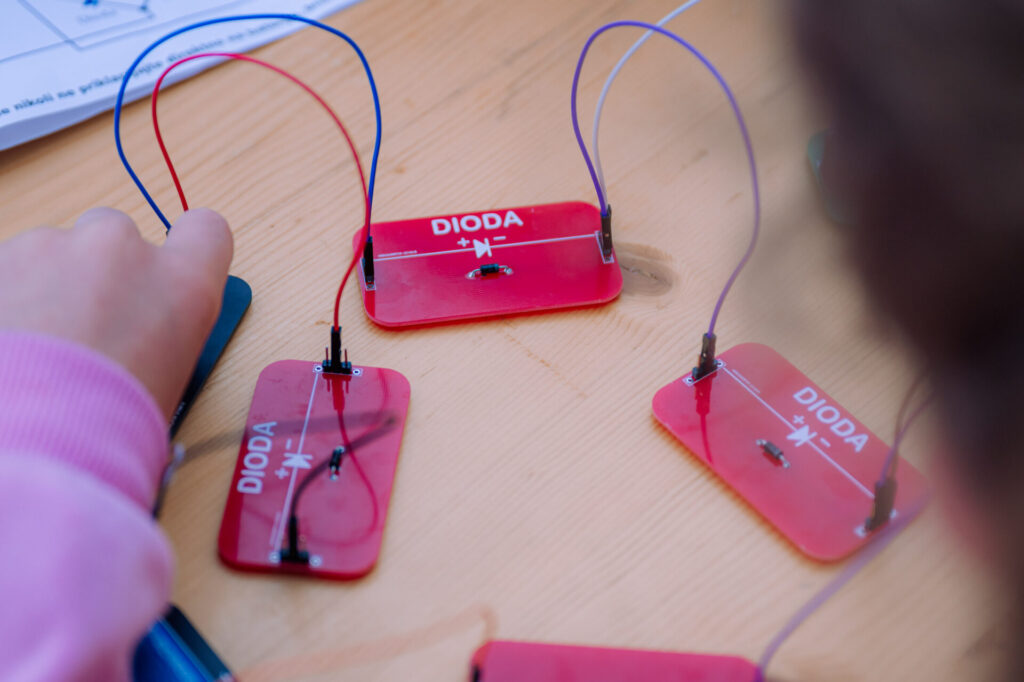 V sodelovanju z ekipo OpenLab so otroci spoznavali osnove električnih vezij – ne s suhoparnimi diagrami, temveč skozi barvna navodila in gradnjo po principu LEGO kock. Vsak je prejel svoj komplet elektronskih komponent in knjižico, na koncu pa še darilce – LED lučko, ki so jo sestavili sami. Ob tem so vadili logično razmišljanje, reševanje problemov in potrpežljivost – mehke veščine, ki jih družba danes še kako potrebuje.