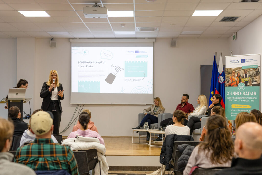 Vodji projekta x-Inno Radar, Maruša in Nataša, sta udeležencem najprej predstavili bistvo projekta, zakaj je naša regija ‘mehko-veščinsko podhranjena’, kakšne pilote izvajamo in kje vidimo priložnosti za spremembe. Skozi interaktivna vprašanja smo skupaj raziskali, katere veščine nam najbolj škripljejo in katere najbolj potrebujemo.